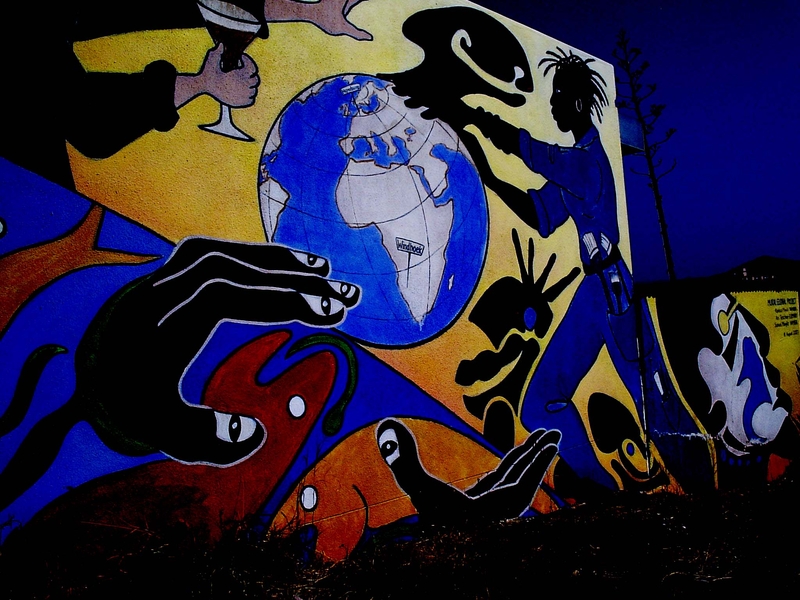 i love the whimsical mural -- the angle just adds to it