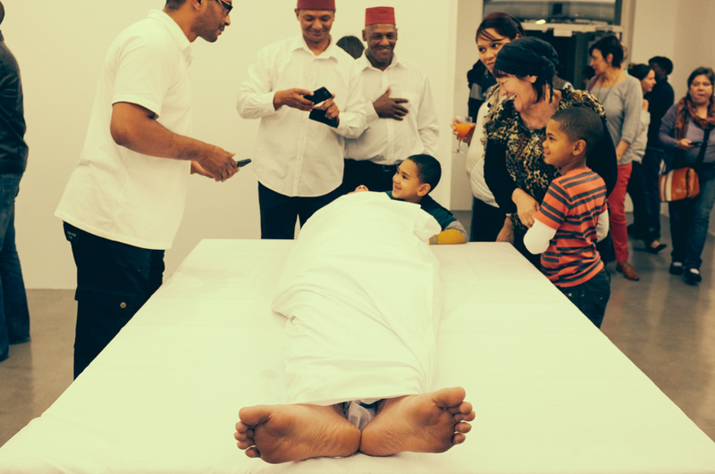 Part of an art installation. the man lying there was cleaned according to the ritual followed by muslims before being buried. he's obviously alive...