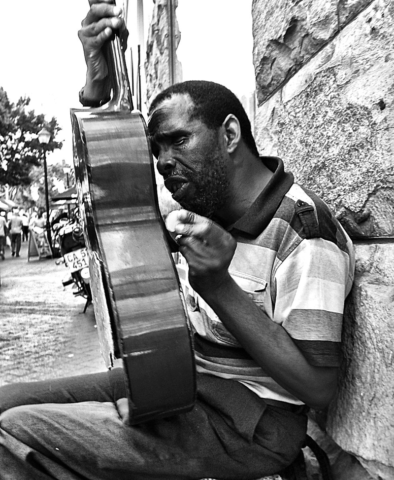I've seen this guy. He likes doing Bob Marley covers etc. His technique of playing is really interesting: the way he holds the guitar to his face while he strums and sings.